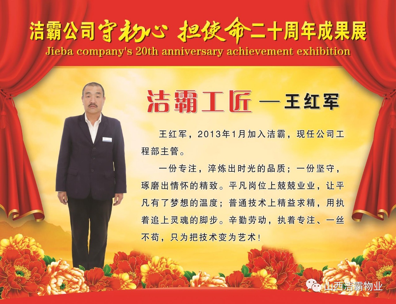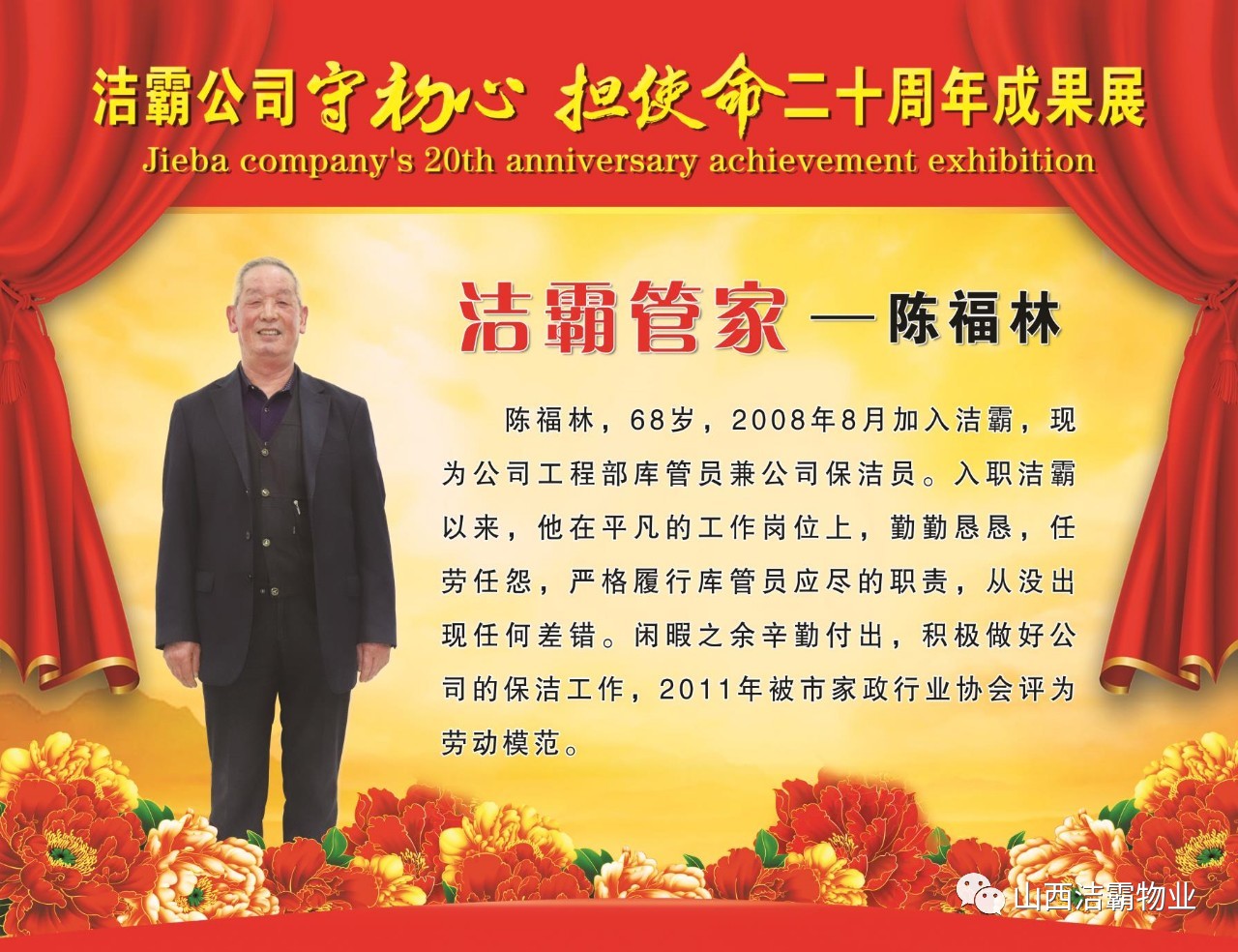 本次晚會(huì)以“潔霸二十華彰,感恩共創(chuàng)輝煌”為主題,此次慶典的核心思想是“感恩”,主要角色是潔霸的創(chuàng)業(yè)者。為此,公司對(duì)入職潔霸的創(chuàng)業(yè)功勛和一線員工進(jìn)行了表彰獎(jiǎng)勵(lì)。本次晚會(huì)共設(shè)8個(gè)獎(jiǎng)項(xiàng),包括“潔霸先鋒”“奉獻(xiàn)之星”“管理之星”“潔霸管家”“潔霸工匠”“清潔之星”“潔霸衛(wèi)士”“園藝之星”等。他們是:李山虎、張永智、史志霞、陳福林、王紅軍、余艷青、劉二丑、成艷粉、楊改梅、王書玲、張國(guó)榮、耿竹青、張粉霞、宋秋苗、陳先梅、張晉平、張偉山、趙瑞軍、王廣平、郭志云。晉城市原副市長(zhǎng)成育廷、晉城市商務(wù)局原局長(zhǎng)王新善、晉城市非公和社會(huì)組織工委書記郎軍芳、晉城市婦聯(lián)三級(jí)調(diào)研員李蓮菊、晉城市總工會(huì)商貿(mào)輕紡煙草服務(wù)業(yè)工會(huì)主席張玉濤、晉城市城區(qū)財(cái)政局局長(zhǎng)翟明太等領(lǐng)導(dǎo)為他們頒獎(jiǎng)