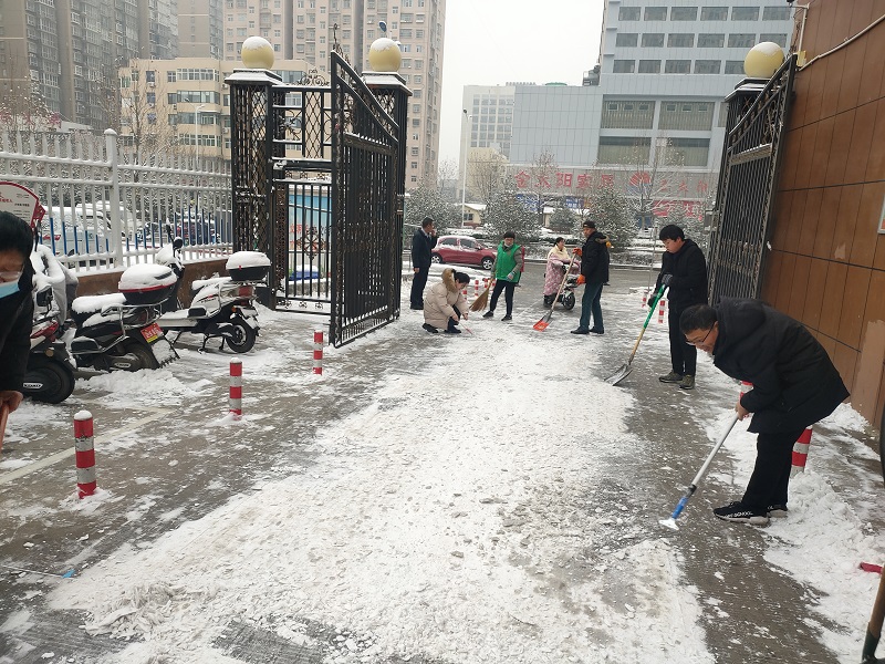 為了景西花園出行居民和公司員工的人身安全,5日早上,公司晨會結(jié)束后,由公司辦公室牽頭,潔霸員工們帶著鐵鍬、掃帚、撬棍等工具,在小區(qū)門口開展清除冰雪活動。