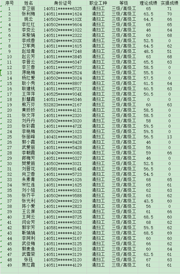 晉城市潔霸清潔服務(wù)股份有限公司職業(yè)技能等級(jí)認(rèn)定中心2024年8月3日第8批保潔員高級(jí)認(rèn)定人員成績公示