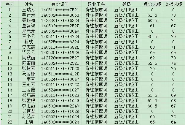 晉城市潔霸清潔服務(wù)股份有限公司職業(yè)技能等級(jí)認(rèn)定中心2024年10月13日第11批保健按摩師初級(jí)認(rèn)定人員成績(jī)公示